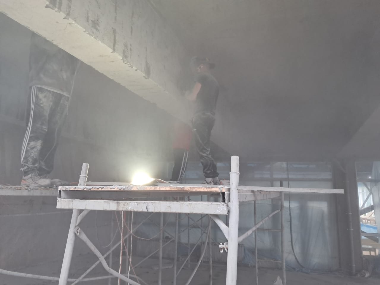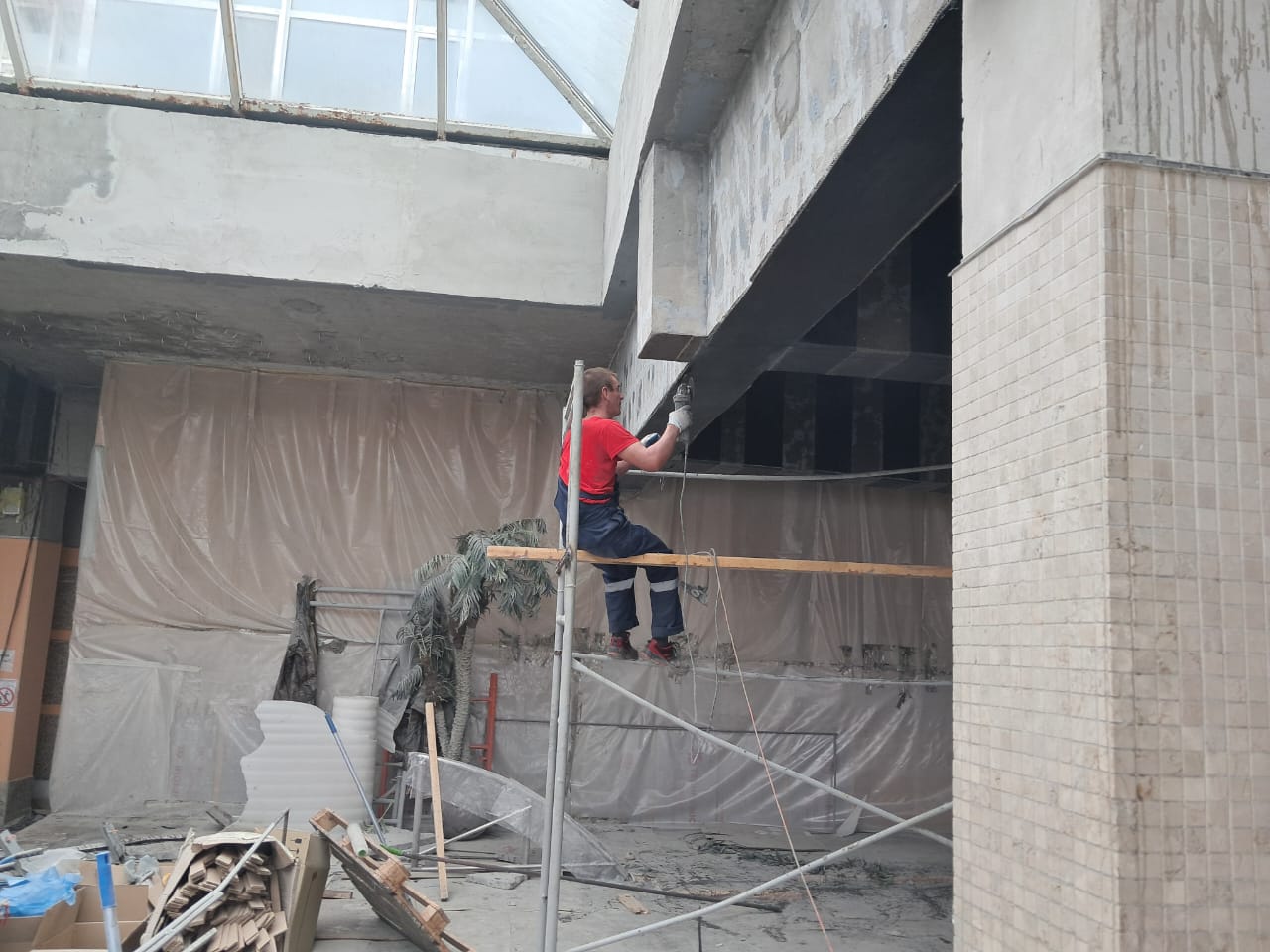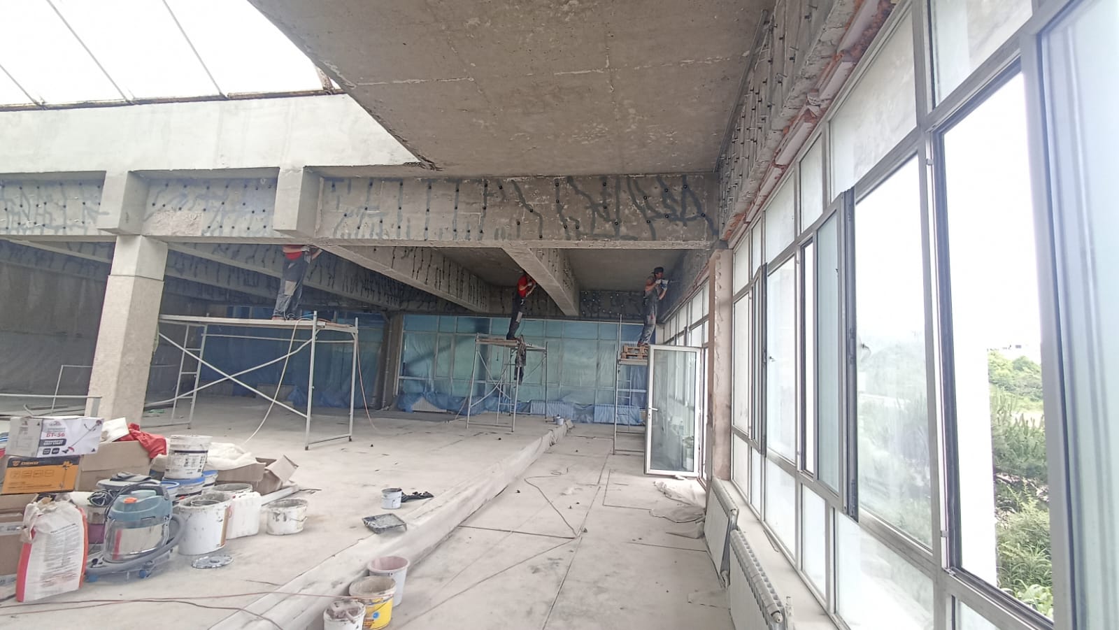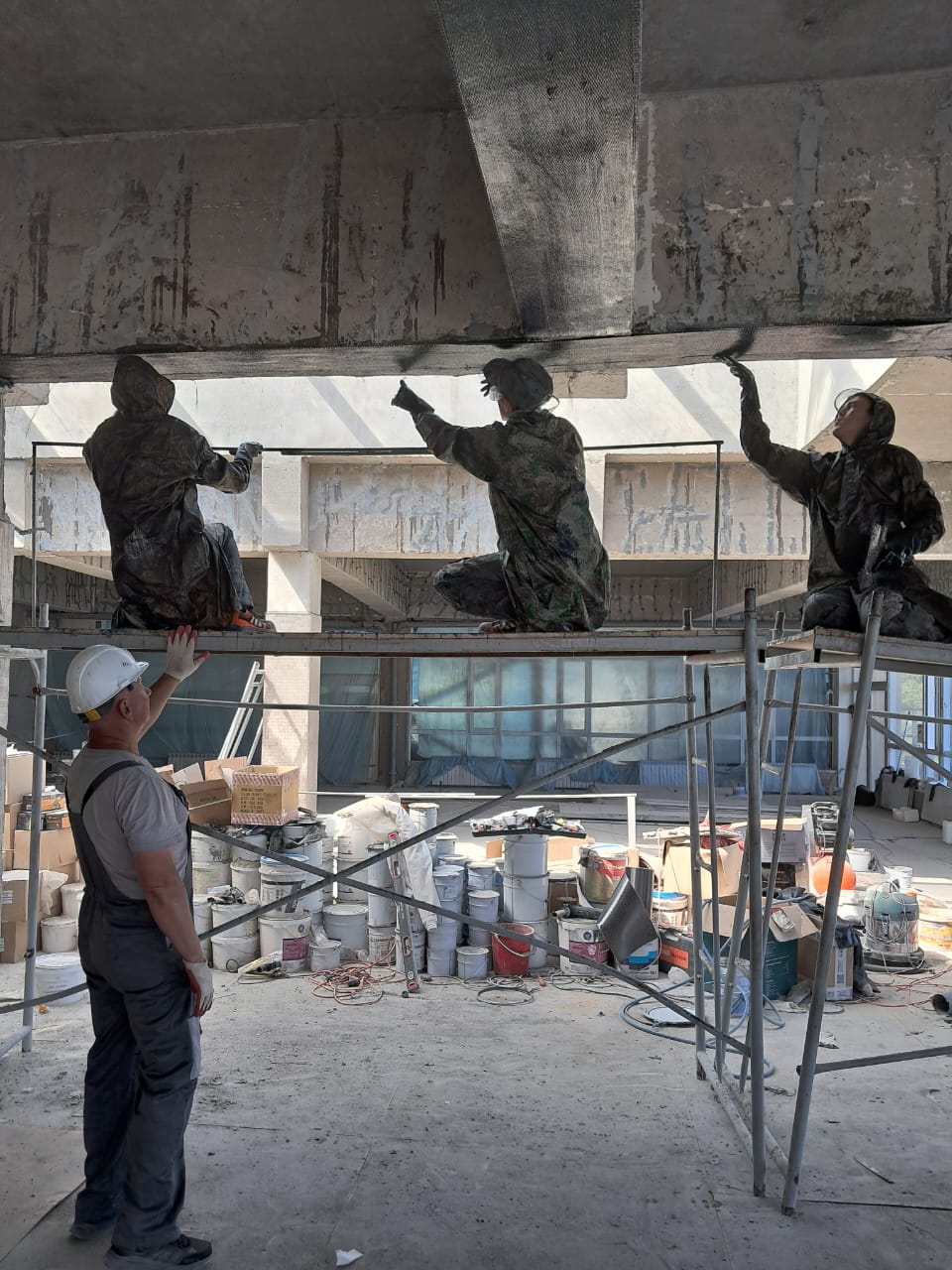 Демонтаж разрушенного защитного слоя бетона на плите перекрытия и зачистка арматуры от ржавчины. Покрытие очищенной арматуры антикорозионным составом. Усиление несущей способности ригельных балок перекрытия методом иньектирования эпоксидных смол в трещины.